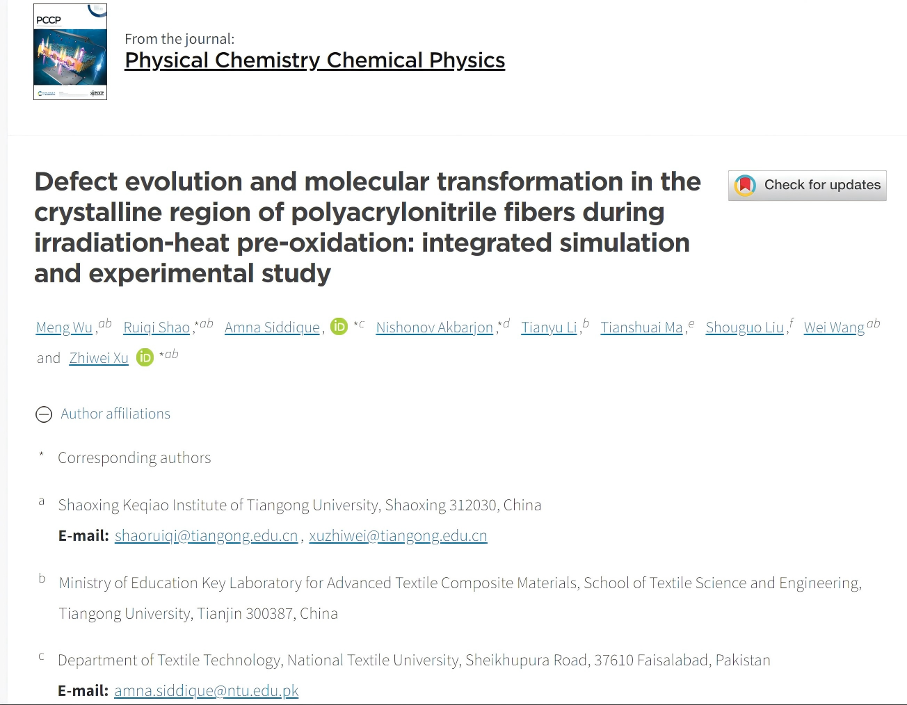 近日,天津工业大学绍兴柯桥研究院徐志伟教授领衔的先进纺织加工研究团队关于聚丙烯腈(PAN)纤维辐照辅助预氧化的最新研究成果《Defect Evolution and molecular transfo